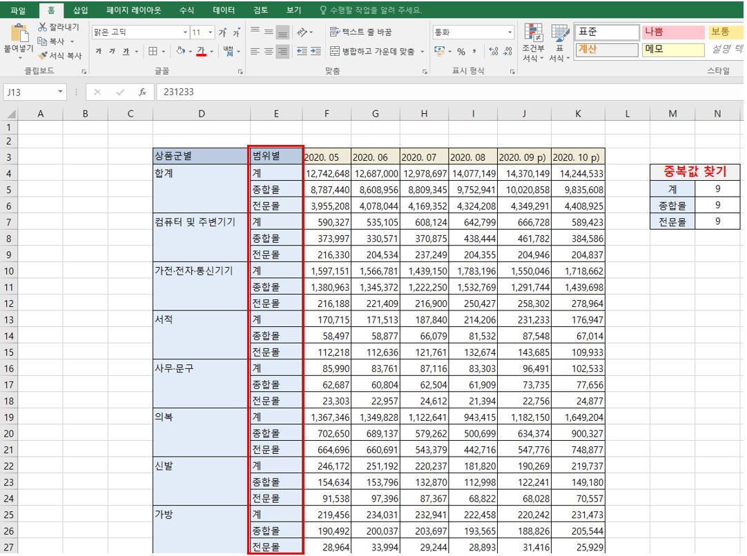 계, 종합몰, 전문몰 이렇게 중복값인데