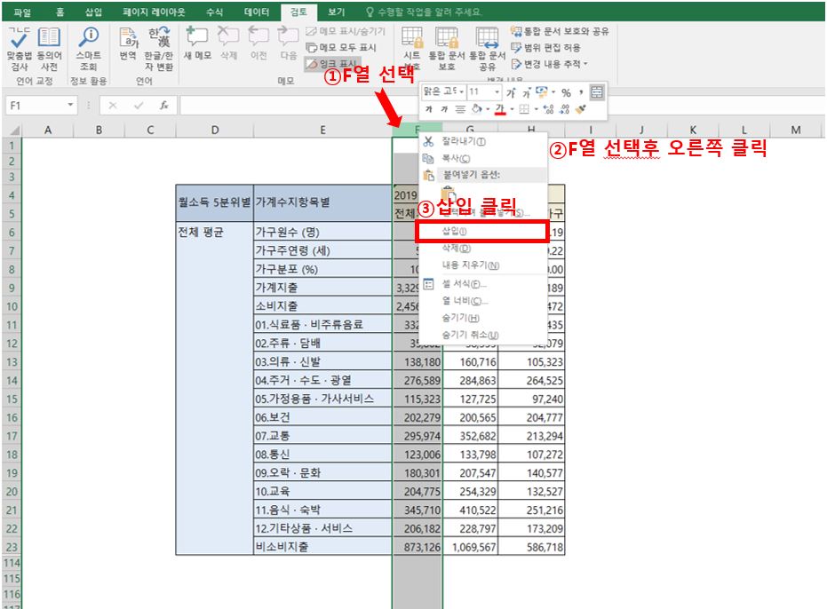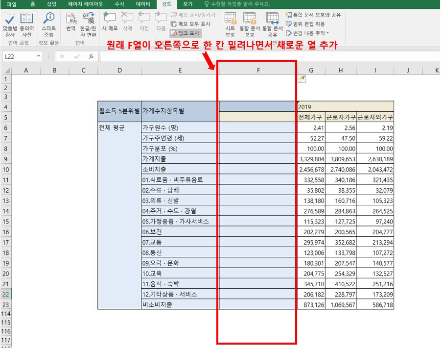 E열과 F열에 사이에 열을 추가하고 싶다고 하면?