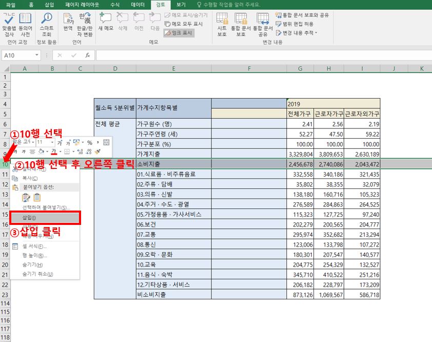 셀선택 - 오른쪽 클릭 - [삽입] 클릭