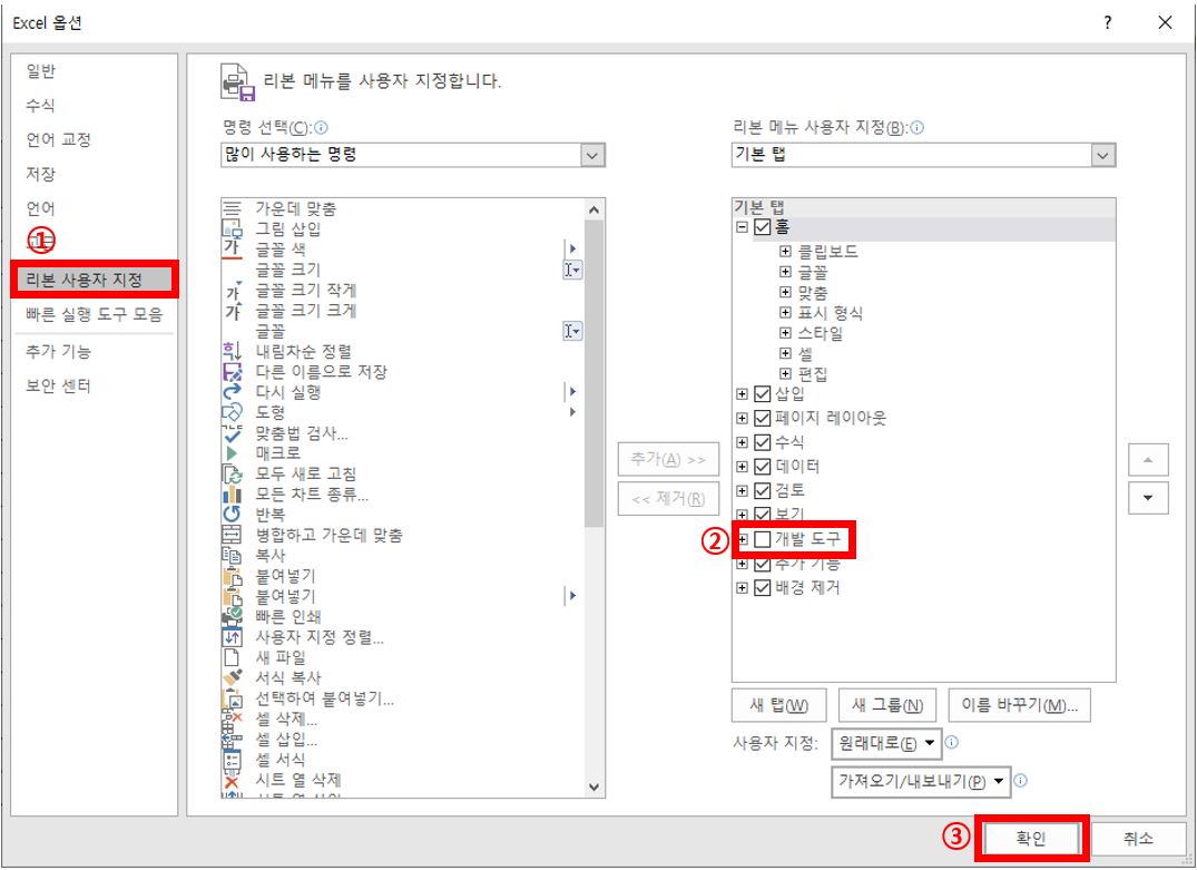 별도로 옵션으로 [개발도구] 탭이 보이게