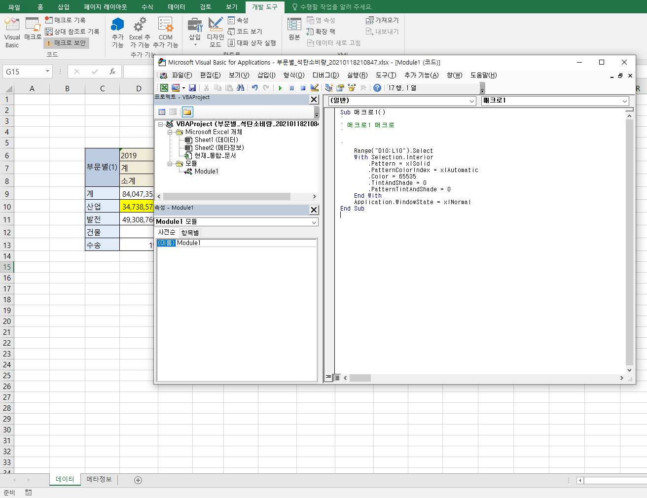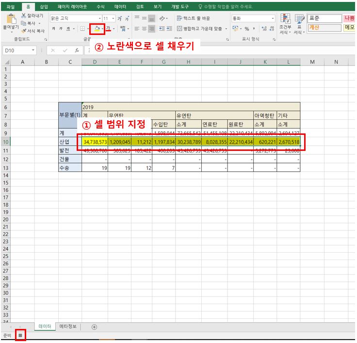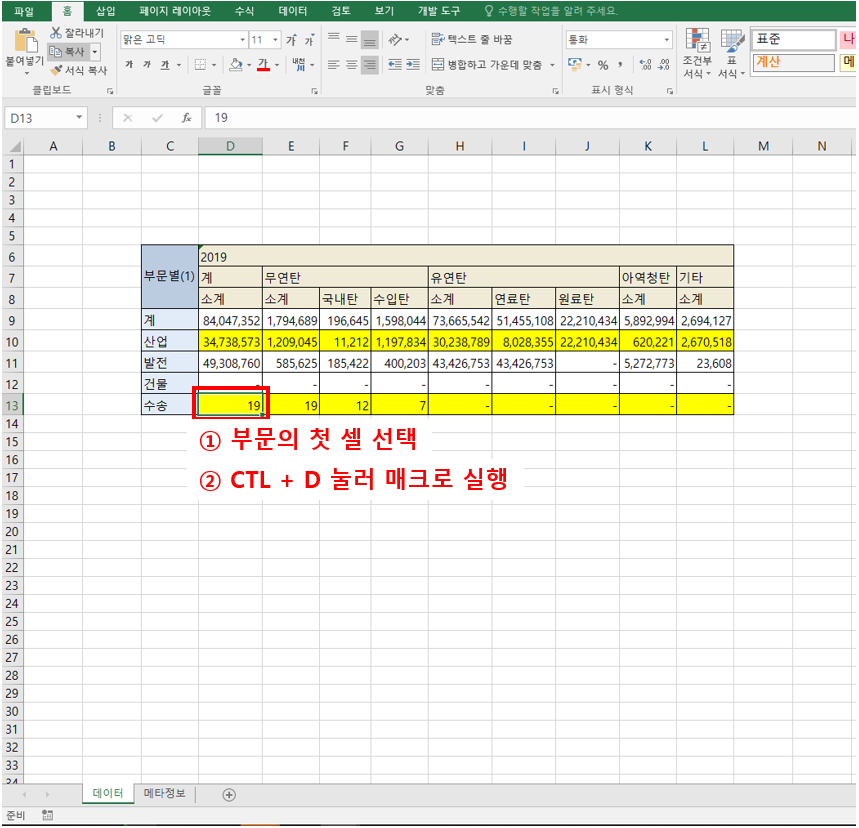 수송부문의 행을 매크로로 색칠해보겠습니다.
