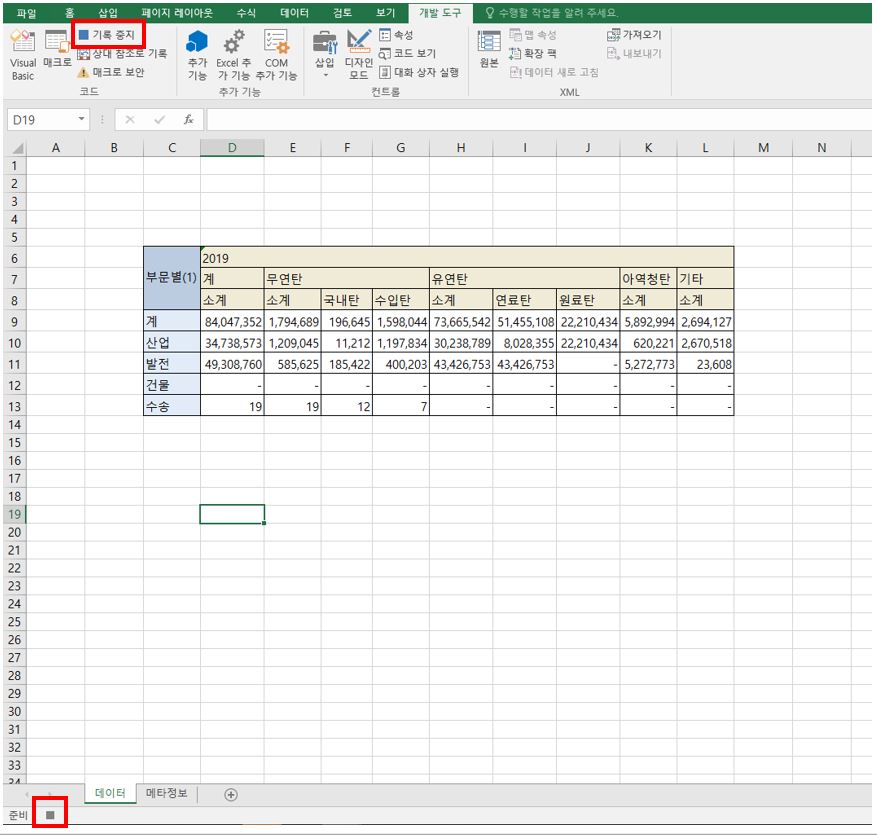 엑셀 창 하단에는 기록 모드가 여전히 보이고 있죠.