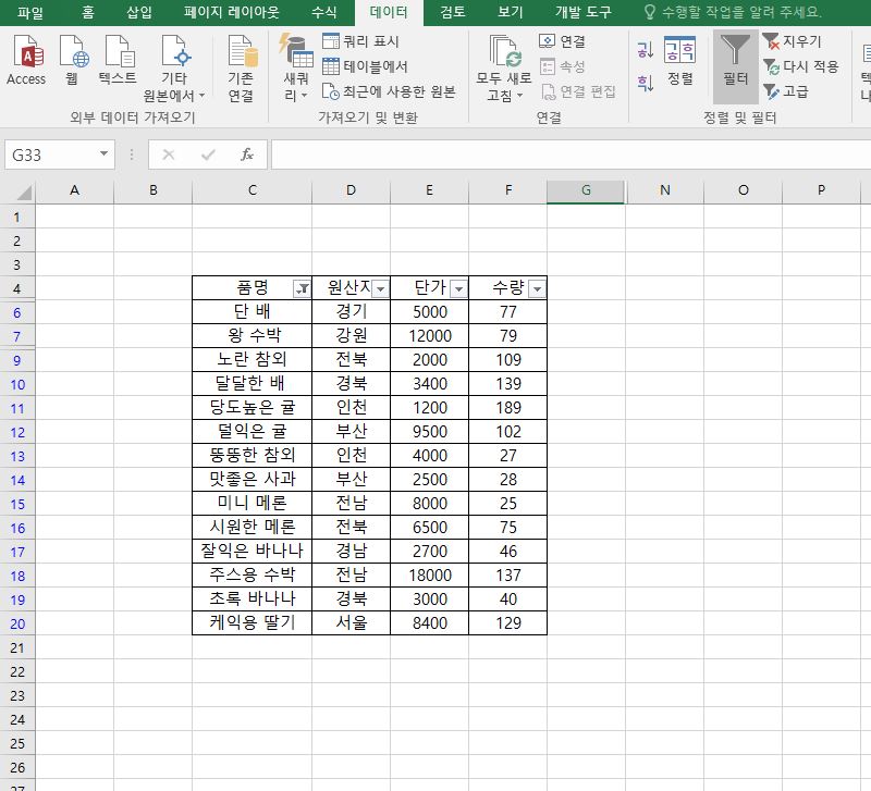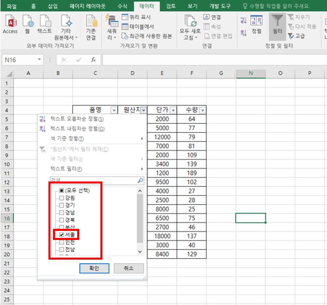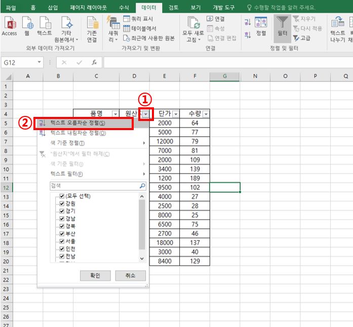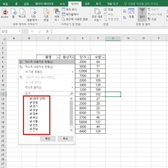 표에서 [원산지]의 오른쪽에 화살표를 클릭하면