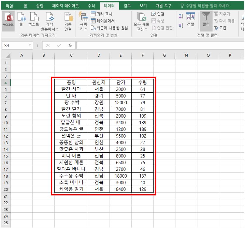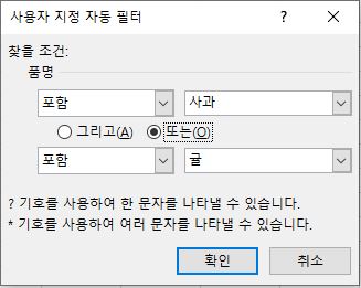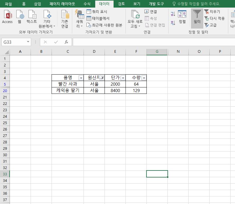 아래와 같이 필터 되어 사과와 귤만 표에서 보실 수 있습니다.